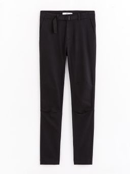 Kalhoty z bavlněné směsi s elastanem. V pase pásek s přezkou. Přední šikmé kapsy a zadní zapuštěné kapsy. Prošité na kolenou.