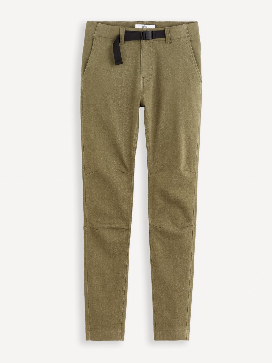 Kalhoty z bavlněné směsi s elastanem. V pase pásek s přezkou. Přední šikmé kapsy a zadní zapuštěné kapsy. Prošité na kolenou.