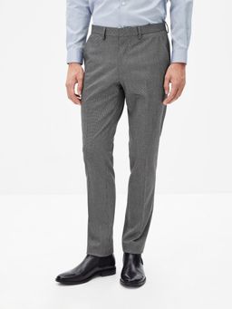 Kalhoty oblekové ve slim střihu. Skryté zapínání na zip, háček a knoflík. Pevný pas s poutky na pásek. Přední šikmé kapsy a zadní kapsy se zapínáním na knoflíčky. Příjemný materiál s elastanem. Nažehlené puky a vzor pepř a sůl.