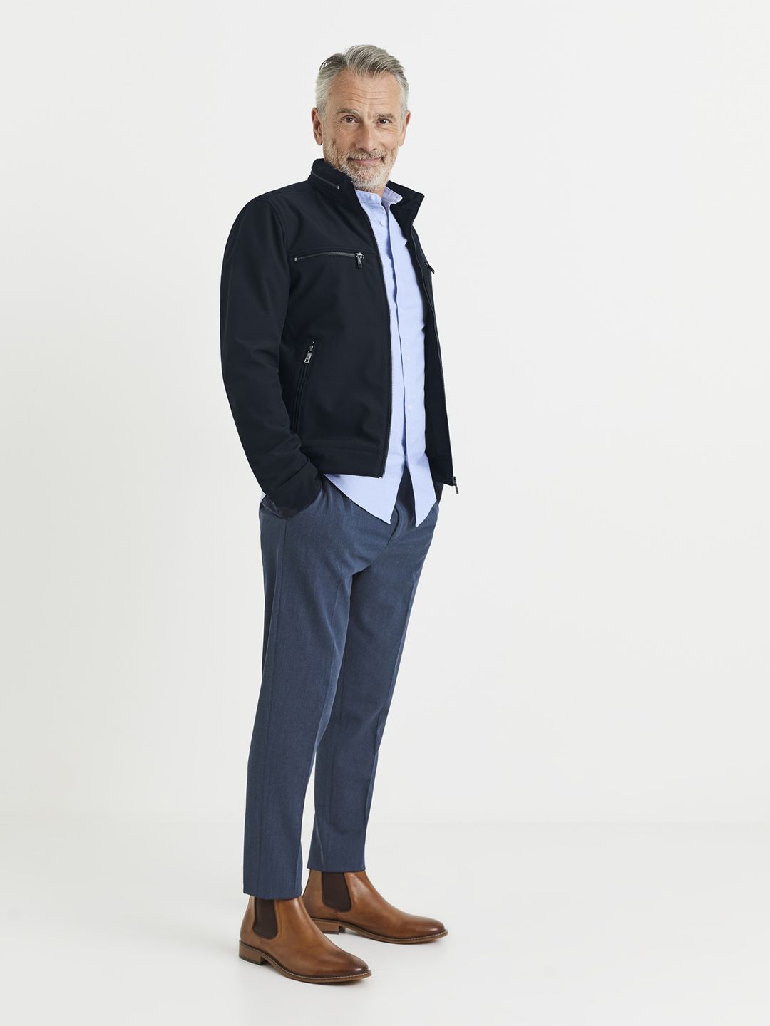 Kalhoty s pružným pasem v modré barvě. V pase stahovací šňůrka. Poutka na pásek.