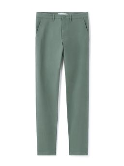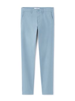 Jednobarevné kalhoty. Úzké chino nohavice z pružné bavlny v keprové vazbě. Kalhoty pro optimální pohodlí ve všech situacích. Pevný pas se zapínáním na zip a knoflík. Poutka na pásek. Přední šikmé kapsy. Zadní kapsy se zapínáním na knoflík.