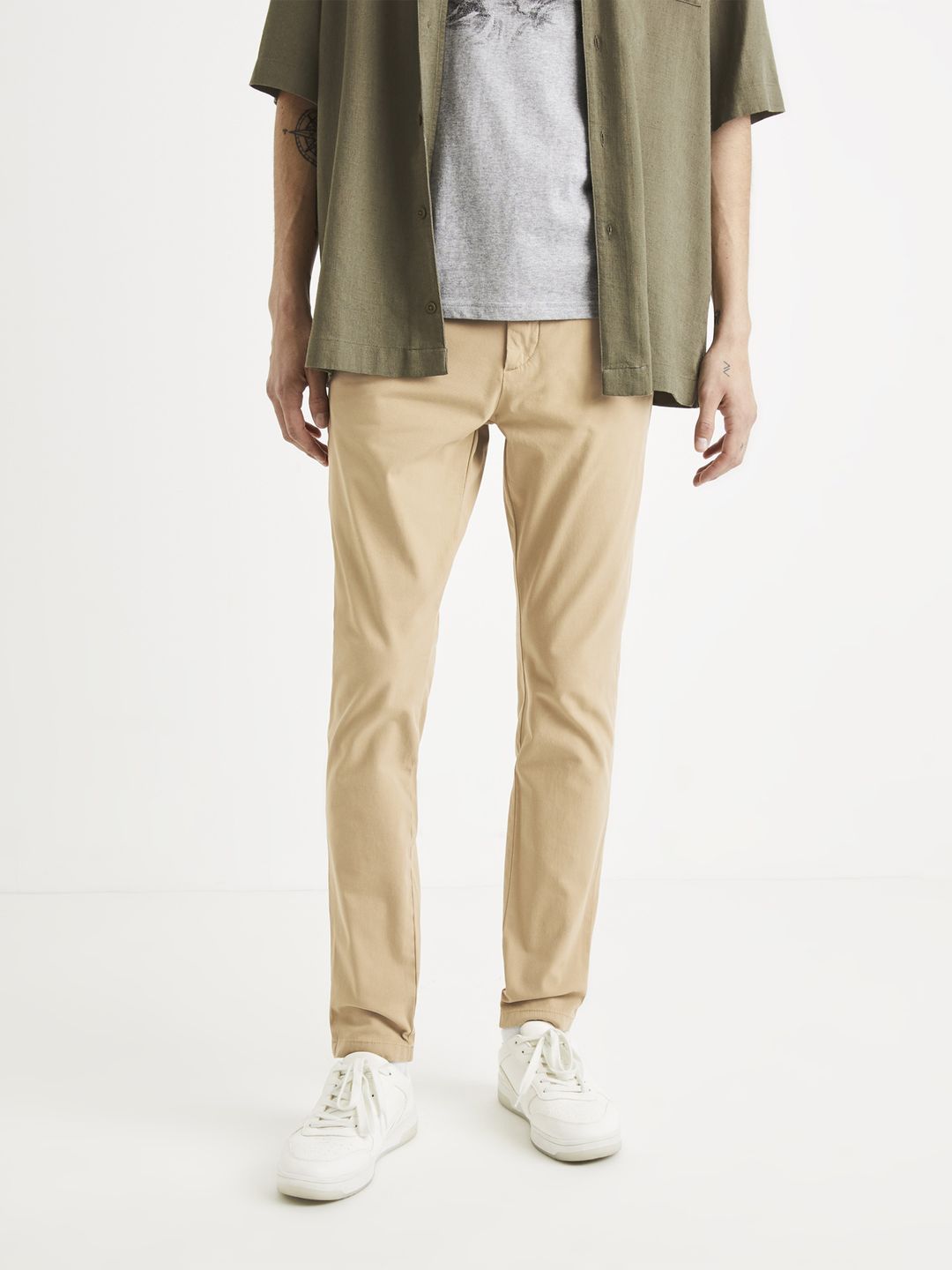Bavlněné kalhoty s elastanem. Pevný pas se zapínáním na zip a knoflík. Poutka na pásek. Šikmé přední kapsy.