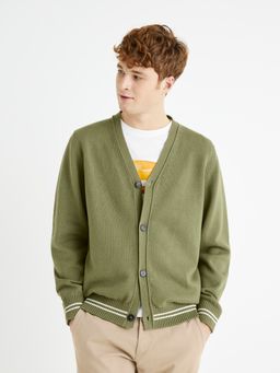 Pánský svetr se zapínáním na knoflíky. Klasický kardigan s hlubším výstřihem do V. Pružné náplety jsou ozdobeny proužky v bílé barvě. 100% bavlněný úplet. Skvěle se hodí k vzorované košili a džínám.