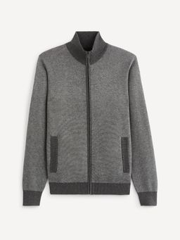 Melírovaný kardigan na zip se stojáčkem. Přední šikmé kapsy. Pružné náplety v tmavě šedé barvě. Příjemný materiál.
