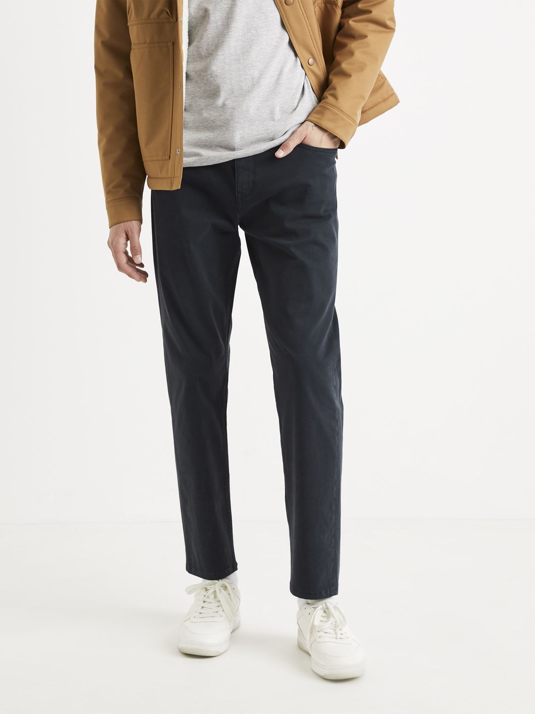 Klasické plátěné kalhoty ve slim střihu. Pevný pas s poutky na pásek. Přední a zadní kapsy. Zapínání na zip a knoflík. Bavlněné s elastanem.
