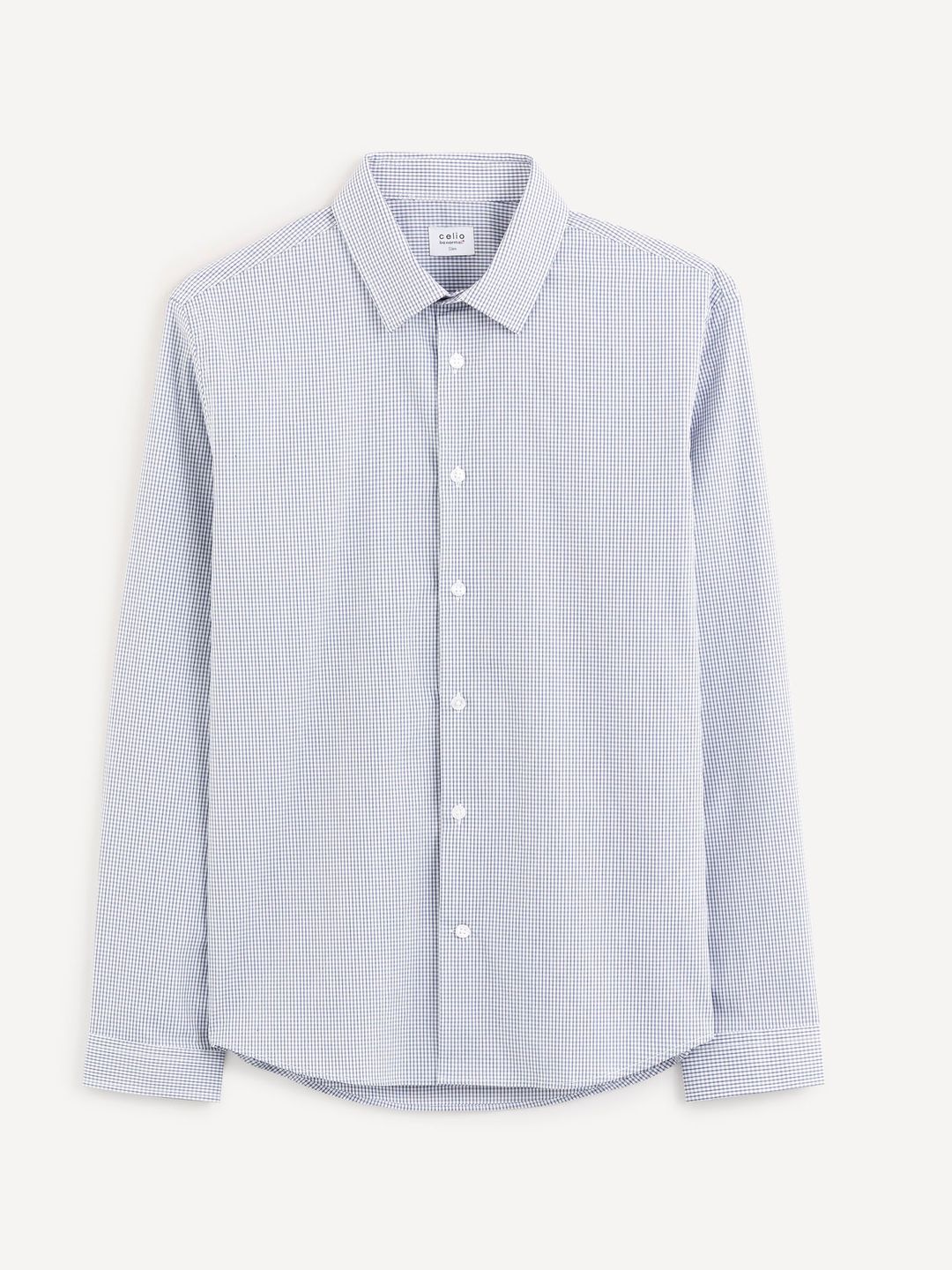 Košile ve slim střihu. Díky elastanu košile perfektně padne. Se zapínáním na drobné knoflíčky. U krku moderní kratší límeček. Dlouhé rukávy zakončeny širokou manžetou. Zaoblený spodní lem.