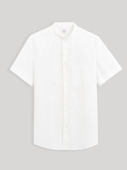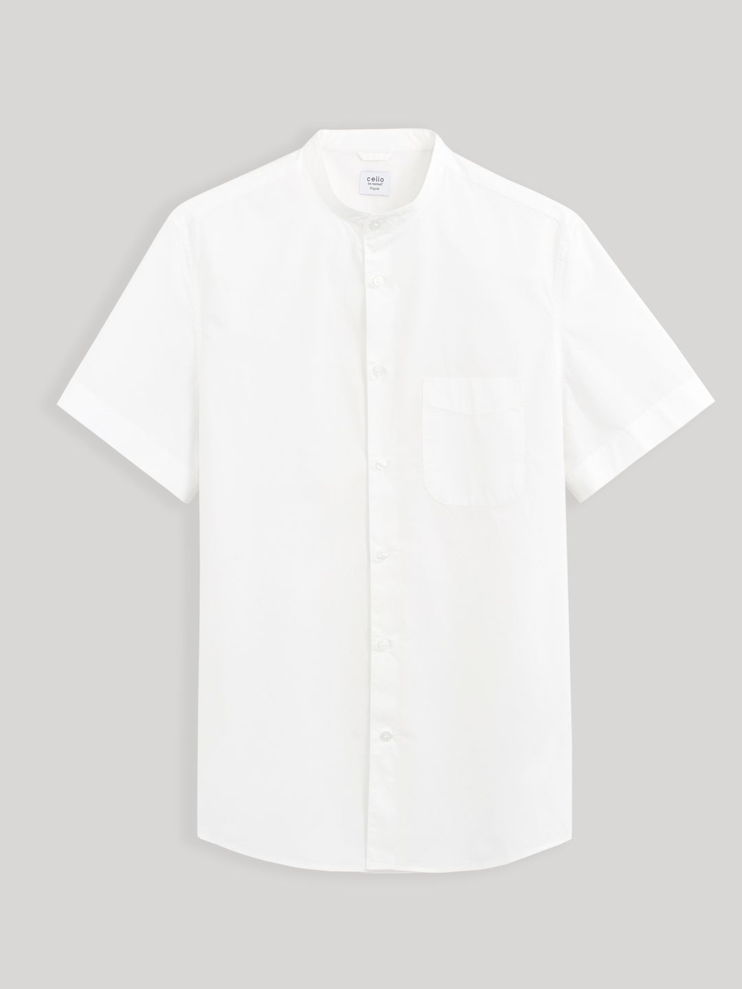 Bavlněná košile se zapínáním na knoflíčky. U krku stojáček bez límečku. Krátký rukáv a na hrudi našitá malá kapsička. Rovný střih a zaoblený spodní lem.