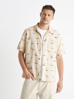 Košile s rozhalenkou a krátkým rukávem se hodí na letní dovolenou. Stačí se podívat na motiv košile - zapadající slunce, lodě, ostrovy a palmy. Tkanina ze směsi lnu a bavlny je perfektní volbou, když teplota stoupá a slunce pálí. Košile se zapíná na knoflíčky a na hrudi má našitou malou kapsičku.