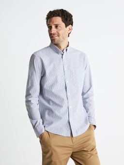 Košile s dlouhým rukávem. Klasický střih s límečkem a malou kasičkou na hrudi. Zapínání na knoflíčky. Drobný proužek. Bavlněná s elastanem.