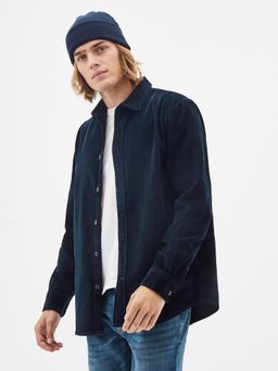 Bavlněná košile v tmavě modré barvě. Moderní krátký límeček. Rovný volný střih. Zapínání na knoflíčky.