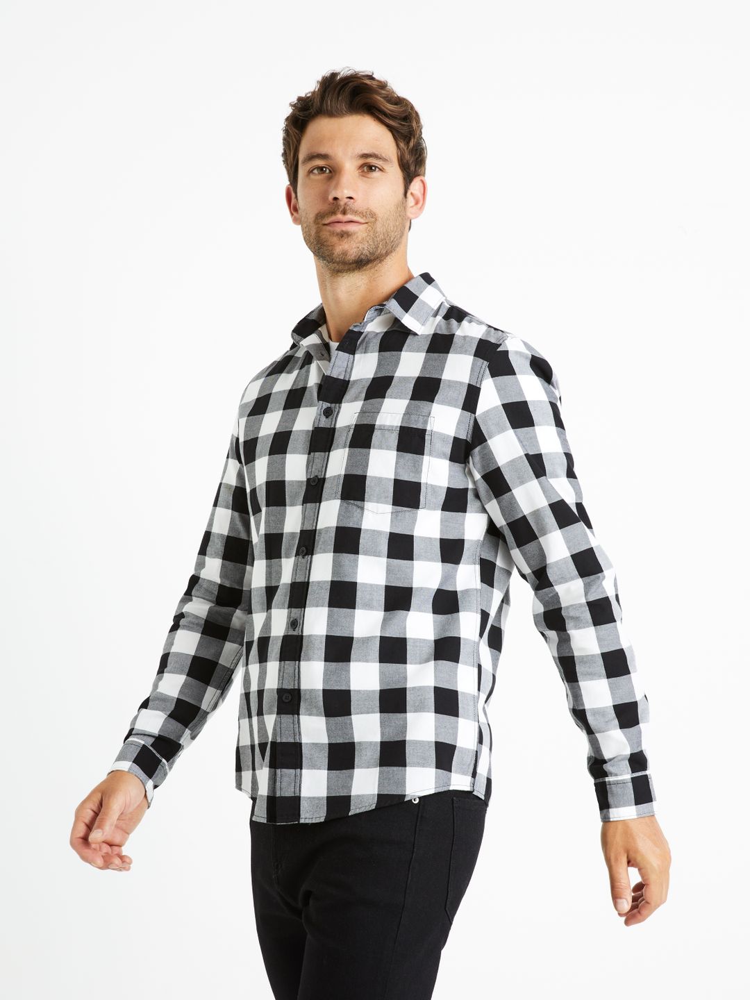 Bavlněná košile s kostkovaným vzorem. Moderní krátký límeček. Zapínání na knoflíčky. Dlouhé rukávy s manžetou. Na hrudi našitá malá kapsa. Zaoblený spodní lem a střih regular.