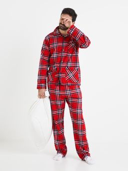 Dvoudílné pyžamo s kostkovaným vzorem. Pyžamový kabátek se zapínáním na knoflíky, u krku rozhalenka a 3 kapsy. Volné pyžamové kalhoty s pružným pasem. 100% bavlna.