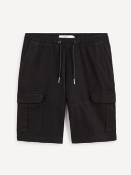 Plátěné kraťasy s pružným pasem. V pase stahovací šňůrka. Přední šikmé kapsy. Zadní zapuštěná kapsa. Našité velké kapsy s klopou.
