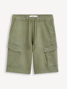 Delší kraťasy bermudy. Pružný pas se stahovací šňůrkou. Přední šikmé kapsy. Velké kapsy s klopou. Zadní kapsa.