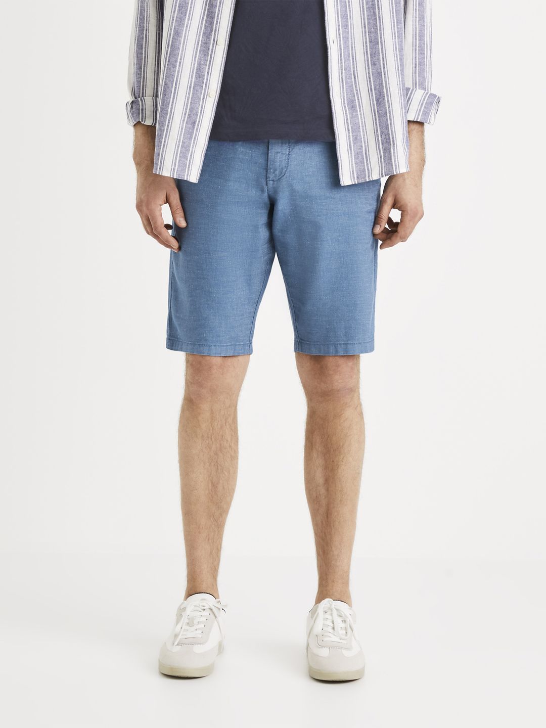 Příjemné kraťasy ze směsi bavlny a lnu. Klasický kalhotový střih. Pevný pas s poutky na pásek. Zapínání na zip a knoflík. Přední šikmé kapsy. Délka nad kolena.