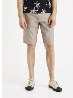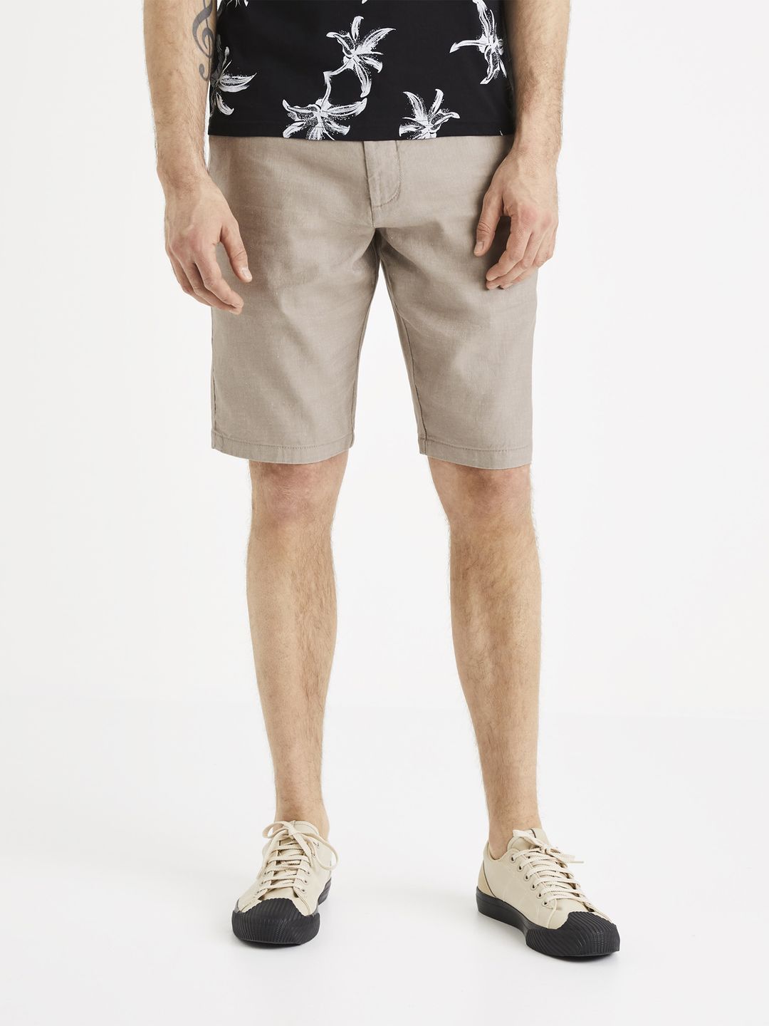 Příjemné kraťasy ze směsi bavlny a lnu. Klasický kalhotový střih. Pevný pas s poutky na pásek. Zapínání na zip a knoflík. Přední šikmé kapsy. Délka nad kolena.
