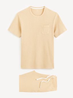 Jednobarevné pyžamo z bavlněného úpletu. Tričko s krátkým rukávem a kulatým výstřihem. Na hrudi našitá malá kapsička. Kraťasy s pružným pasem a kapsami.