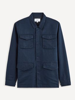 Lehká jednobarevná buda ze lnu a bavlny. Košilový límeček ke krku. Na přední straně kapsy s klopami. Dlouhé rukávy s manžetou. Rovný střih a celopropínací.