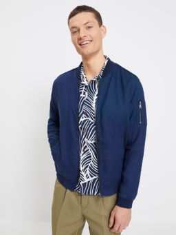 Jednobarevná lněná bunda do pasu. Střih bomber. Zapínání na zip. Dlouhé rukávy s náplety. Na jednom rukávu kapsička na zip. Přední šikmé kapsy.