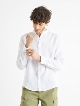Lněná košile se zapínáním na knoflíčky. U krku stojací límec. Dlouhé rukávy s manžetou. Jednobarevná.