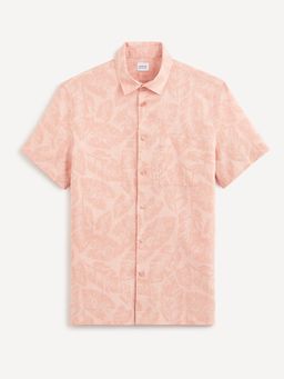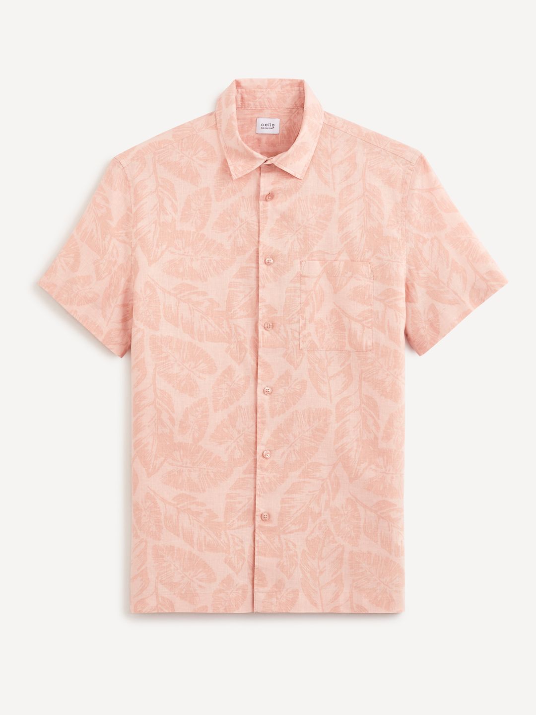 Lněná košile s krátkým rukávem a plošným vzorem. Klasický límeček a kapasička na hrudi. Celopropínací na knoflíky.