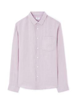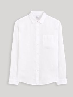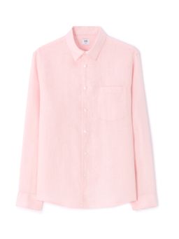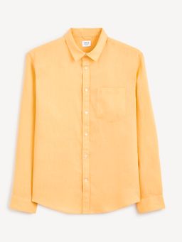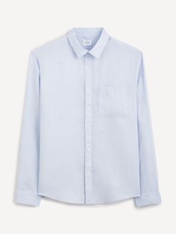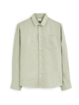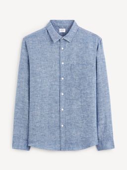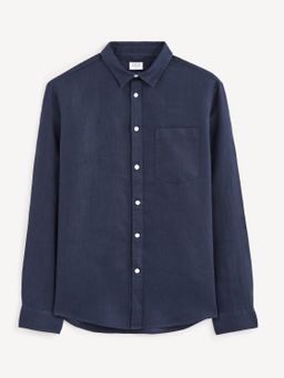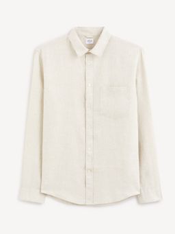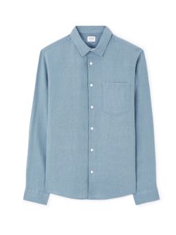 Lněná košile s dlouhým rukávem. Klasický límeček a zapínání na knoflíčky. Na hrudi našitá malá kapsička. Rovný střih.