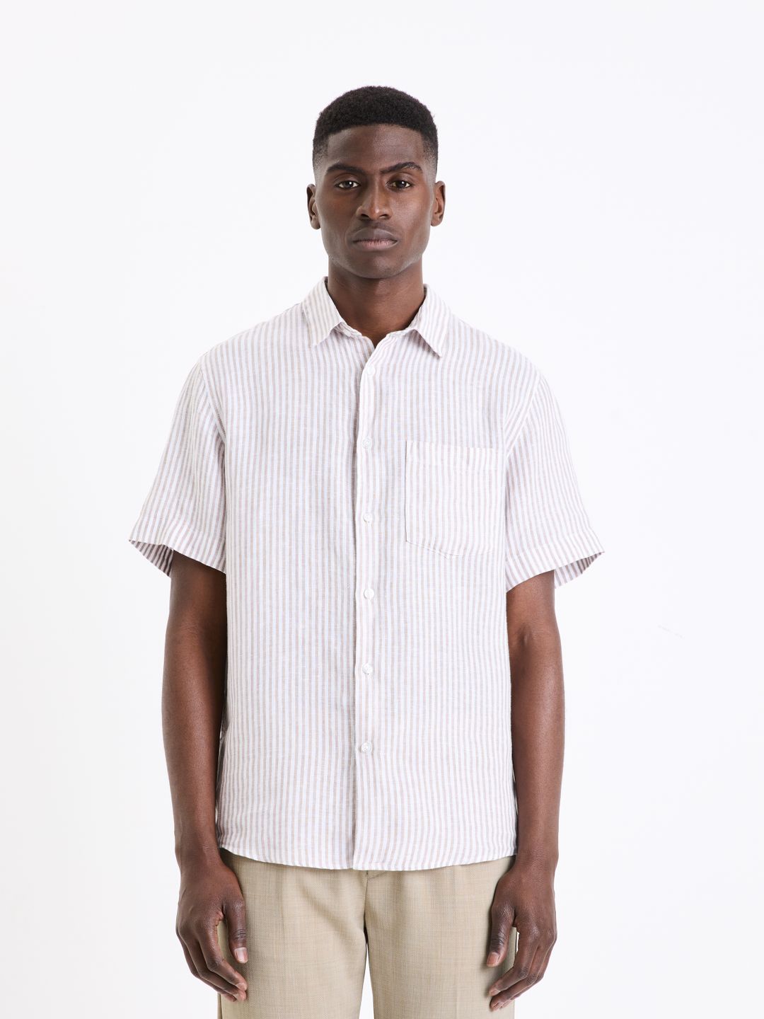 Lněná košile s krátkým rukávem. Límeček a zapínání na knoflíčky. Na hrudi našitá kapsička. Rovný střih. Jednobarevná.