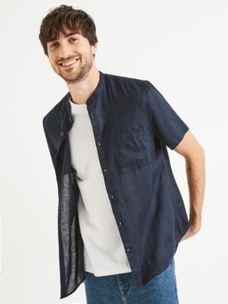 Lněná košile s krátkým rukávem. Na hrudi malá kapsička. Stojáček u krku bez límečku.