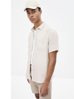 Lněná košile ve volném reguler střihu. Neformální košile se stojáčkem u krku. Krátké rukávy se zapínání na knoflíčky.