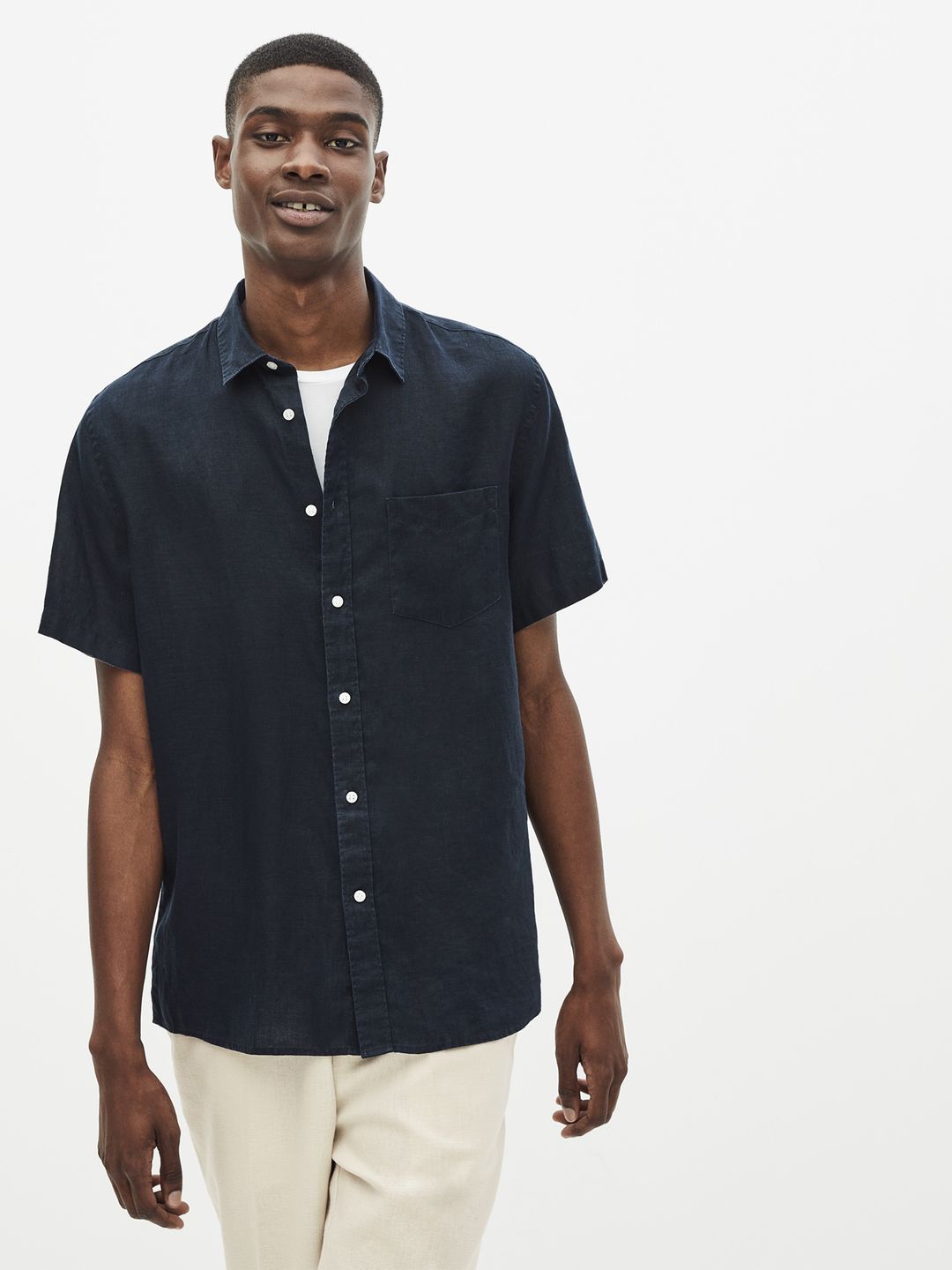 Lněná košile ve volném reguler střihu. Neformální košile se stojáčkem u krku. Krátké rukávy se zapínání na knoflíčky.
