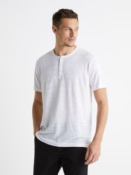 Lněné tričko s krátkým rukávem. Kulatý výstřih se zapínáním na 3 knoflíčky. Krátký rukáv a rovný střih. Vyrobeno ze 100% lnu. Tento materiál je ideální na léto. Jednobarevné tričko lze dobře kombinovat.