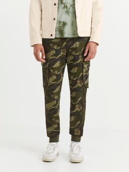 Maskáčové kalhoty cargo s elastanem. Pružný pas se stahovací šňůrkou. Velké boční kapsy s klopami. Přední šikmé kapsy. Zadní skryté kapsy. Nohavice zakončené do pružného lemu.