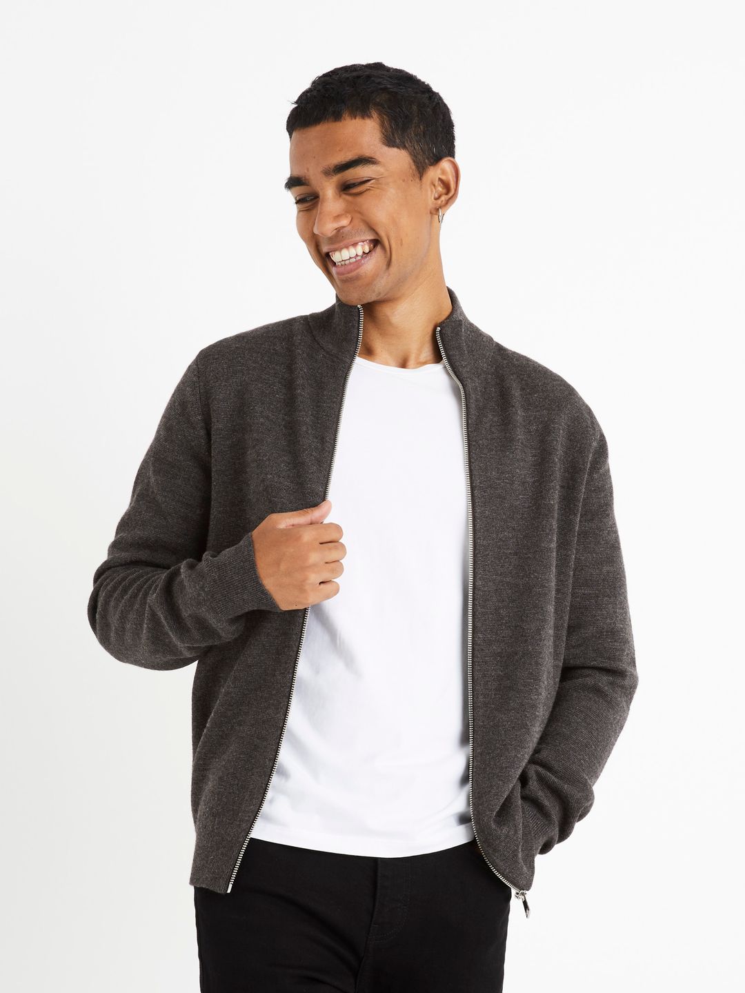 Svetr kardigan se zapínáním na zip. Příjemný materiál z merino vlny. U krku stojáček. Tmavě šedý melír. Hladký svetr jednoduchého střihu lze nosit i rozepnutý přes tričko nebo košili.