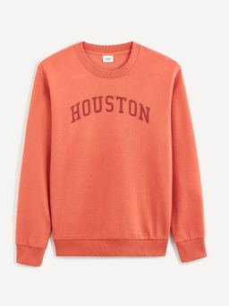 Oranžová mikina s nápisem Houston. Střih bez zapínání. Široké a pružné náplety. Příjemný materiál. Mikinu nejlépe doplní džíny a tričko.