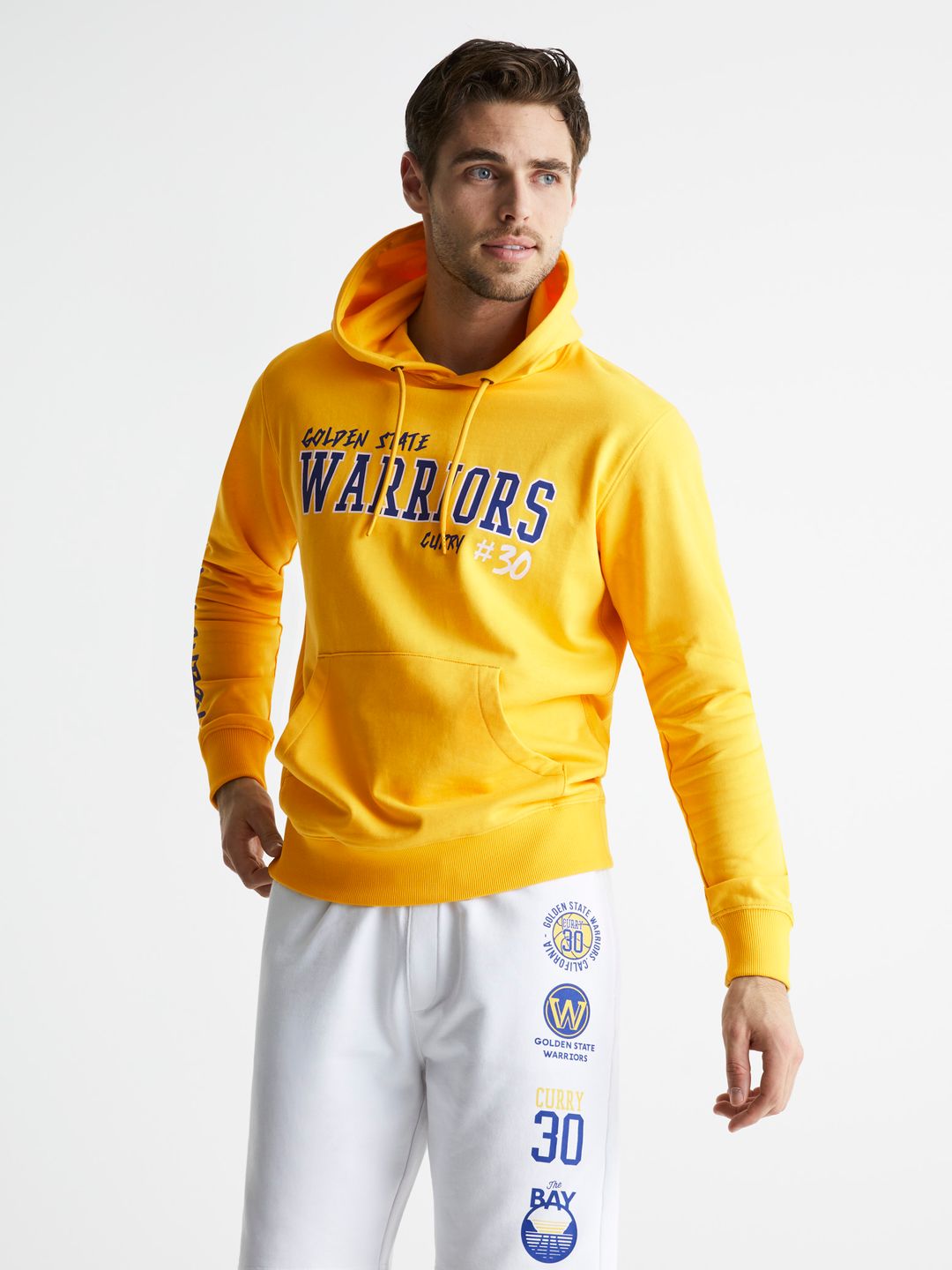 Žlutá mikina z limitované edice NBA. Střih přes hlavu a s kapucí. Na přední straně potisk Golden State Warriors a číslo 30 hráče Stephen Curry. Kapuce má stahovací šňůrku. Nechybí prostorná klokaní kapsa a dlouhé rukávy s náplety. Na rukávu nápis Stephen Curry. Na zádech The BAY Golden State Warriors.