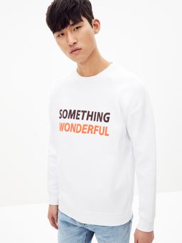 Bílá mikina s nápisem Something wonderful. Střih přes hlavu a dlouhé rukávy. Široké a pružné náplety.