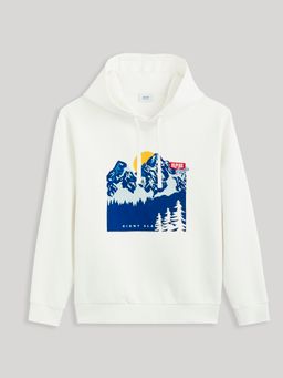 Mikina v bílé barvě s výrazným potiskem na přední straně. Drobná výšivka, kapuce se stahovací šňůrkou a dlouhé rukávy s náplety.