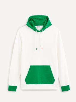 Bavlněná mikina s kapucí a klokaní kapsou. Kapuce se stahovací šňůrkou v zelené barvě. Klokaní kapsa a pružné náplety rukávů také v zelené barvě.