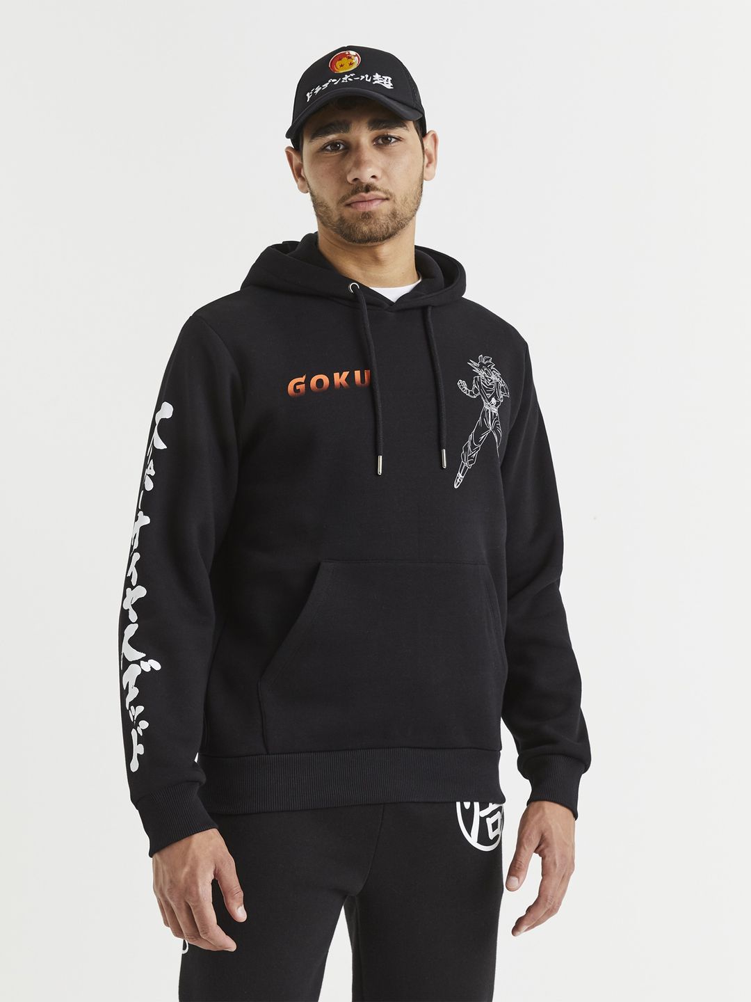 Mikina s kapucí a potiskem Dragon Ball Super. Střih přes hlavu. Dlouhé rukávy s náplety.
