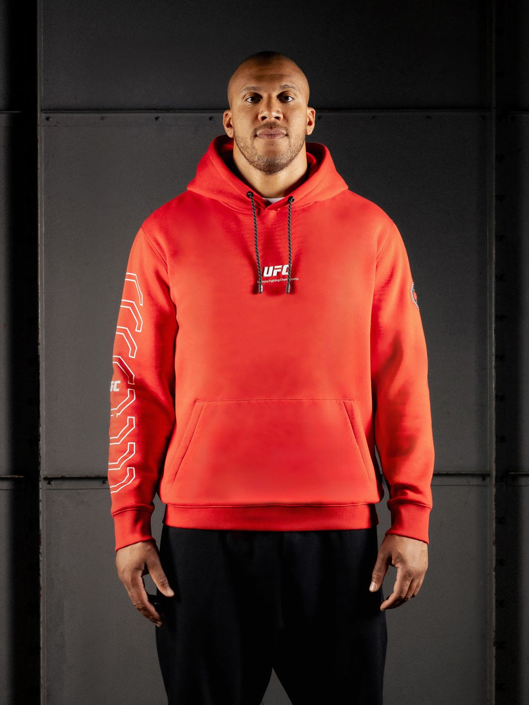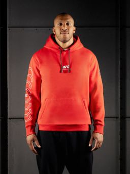 Červená mikina s kapucí a logem UFC na přední i zadní straně. Potisk na rukávu. Kapuce se stahovací šňůrkou.