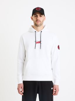 Objev naši novou exkluzivní kolekci s UFC! Bílá mikina s kapucí a logem UFC na přední straně a rukávu. Na zadní straně výrazný potisk. Kapuce se stahovací šňůrkou v kontrastní barvě. Prostorná klokaní kapsa. Dlouhé rukávy a pružné náplety.