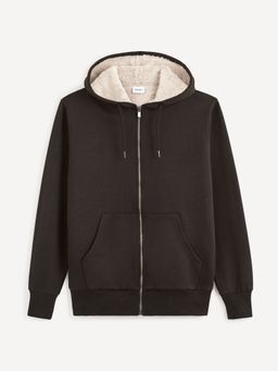 Mikina v černé barvě a s kapucí. Zateplená umělým beránkem. Kapuce se stahovací tkaničkou. Na přední straně našitá dělená klokaní kapsa. Dlouhé rukávy s náplety.
