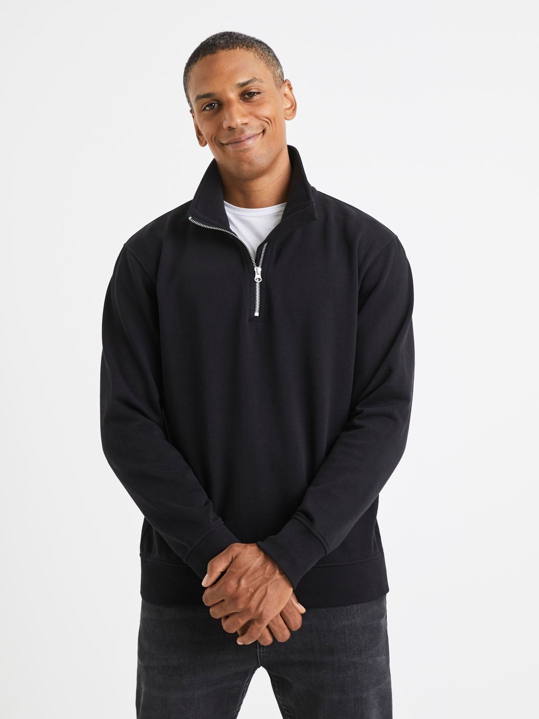 Mikina se stojáčkem u krku a zapínáním na zip. Dlouhé rukávy a široké náplety. 100% bavlna.