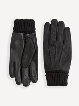 Prstové rukavice kombinované. Z jedné strany hřejivá vlněná látka a z druhé pravá useň. Široký a pružný náplet.