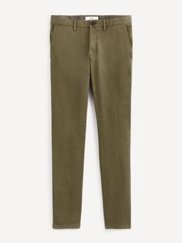 Bavlněné kalhoty s elastanem. Pevný pas se zapínáním na zip a knoflík. Poutka na pásek. Šikmé boční kapsy.