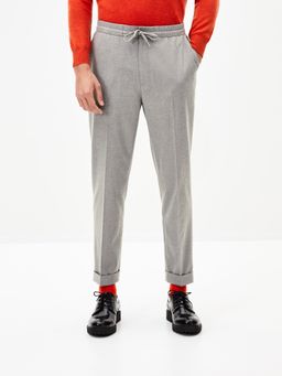 Pánské kalhoty s pružným pasem. V pase navíc stahovací šňůrka. Přední šikmé kapsy. Příjemný materiál lehce pruží. Světle šedý melír.