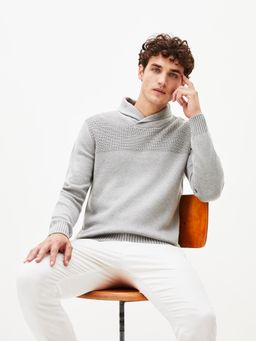 Pletený svetr se šálovým límcem. Světle šedá barva a drobný vzor. Příjemný materiál.