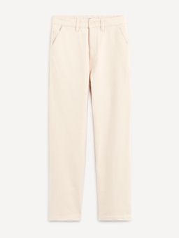 Plátěné kalhoty s pevným pasem. Zapínání na zip a knoflík. V pase nechybí poutka na pásek. Přední šikmé kapsy a zadní našité velké kapsy. Po stranách také kapsy. Kalhoty jsou v béžové barvě a ušity z bavlny s elastanem.