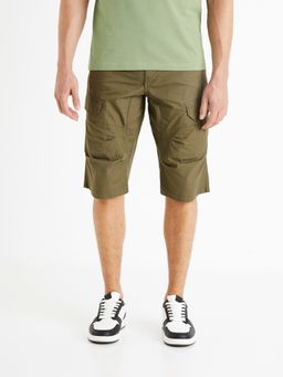 Bavlněné kraťasy s kapsami. Pevný pas s poutky na pásek. Zapínání na knoflík a zip. Přední šikmé kapsy. Zapuštěné kapsy s klopou. Délka ke kolenům.