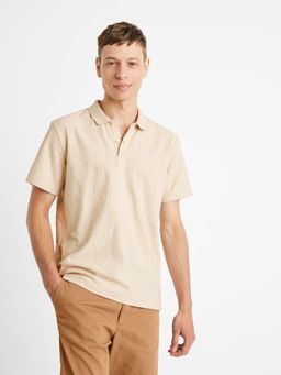 Jednobarevné tričko s plastickým květinovým vzorem. Klasický měkký límeček a u krku zapínání na dva knoflíčky. Krátké rukávy a rovný střih. Bavlněné s elastanem.